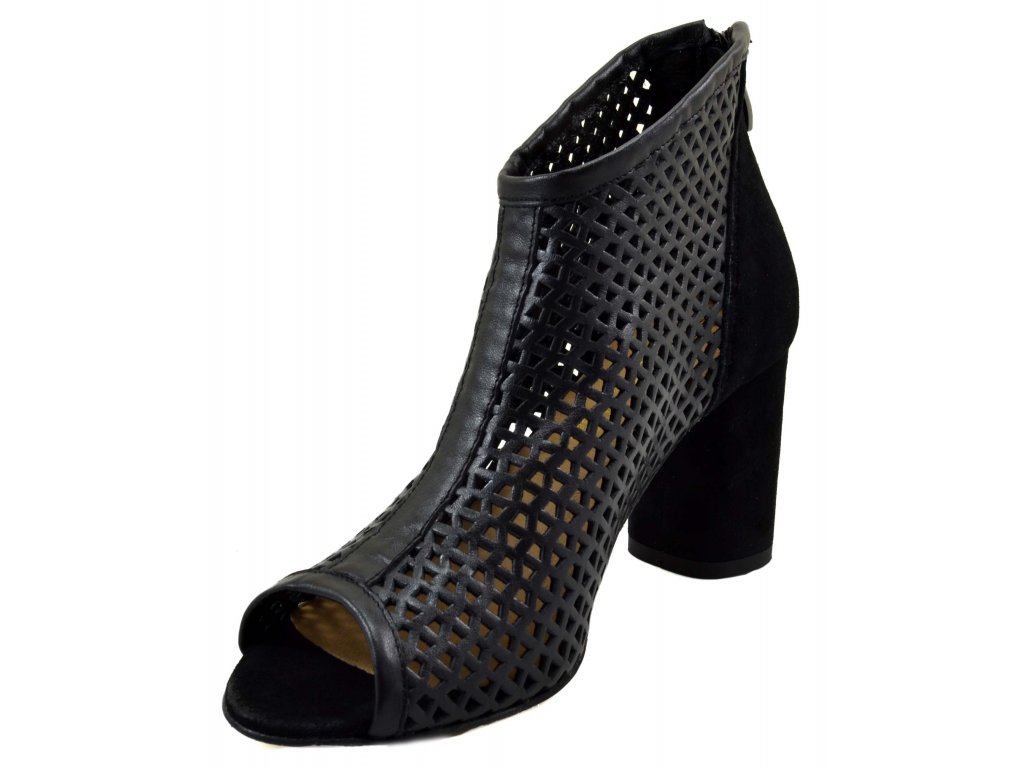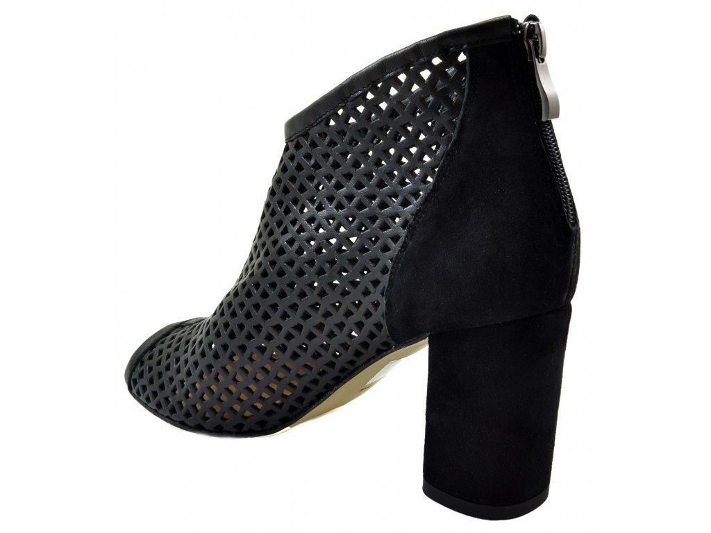 - Vyrobeno v kombinaci černé hladké kůže s dírkovým motivem přes celý nárt až pod kotník a kůže černé broušené na patě. Zapínání zipem na patě nožku dobře upevní v obuvi.