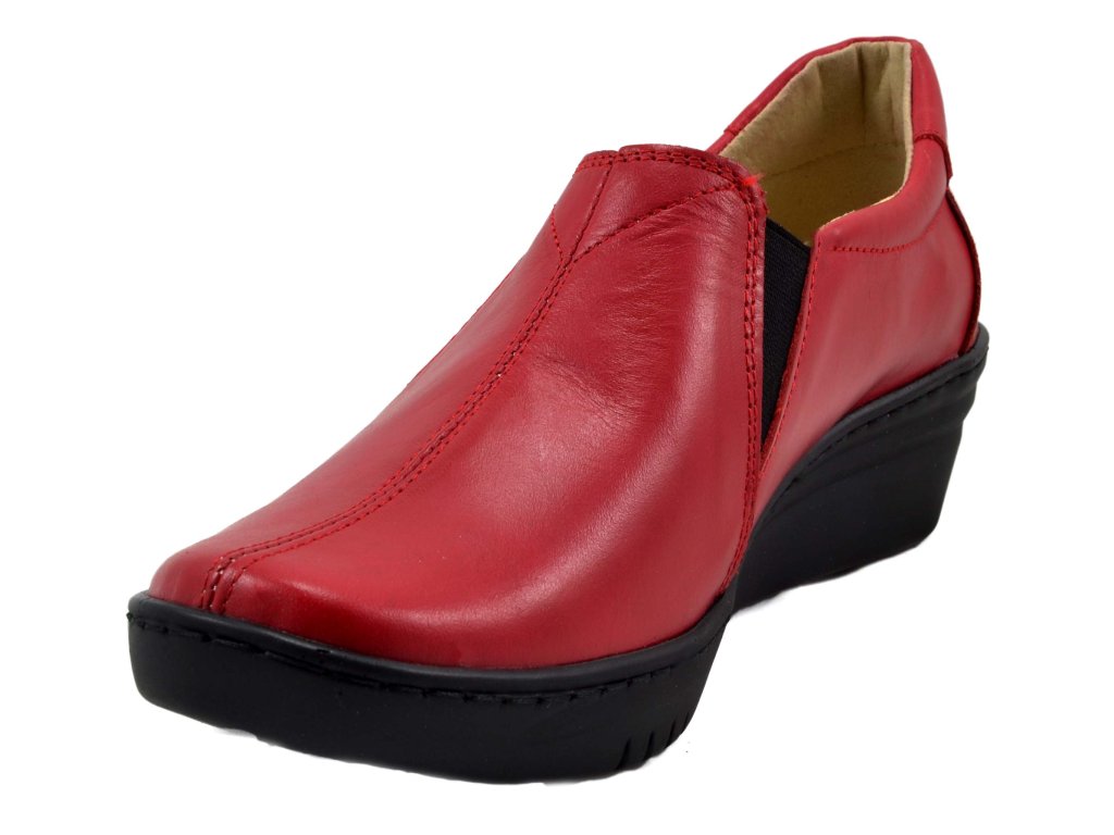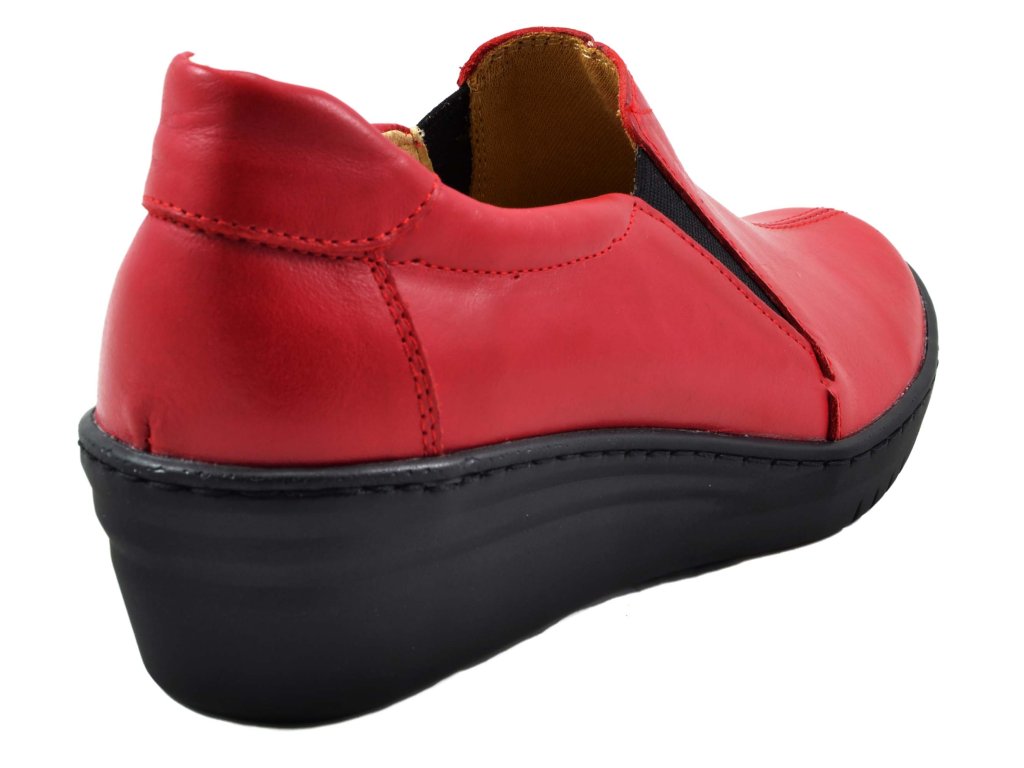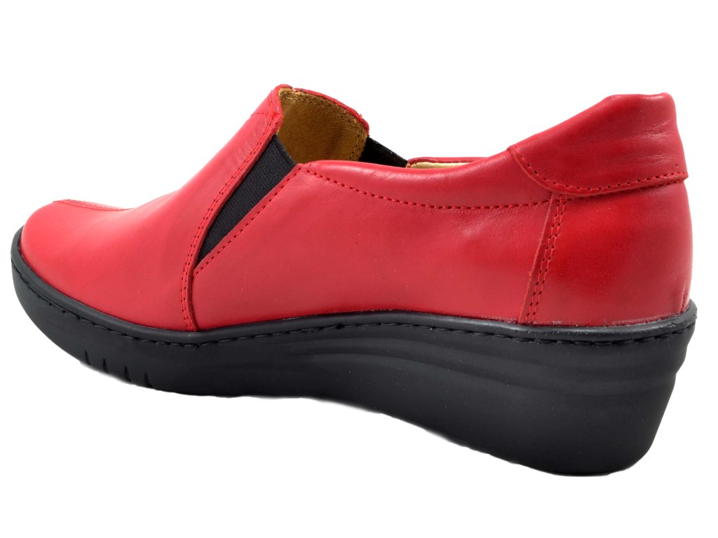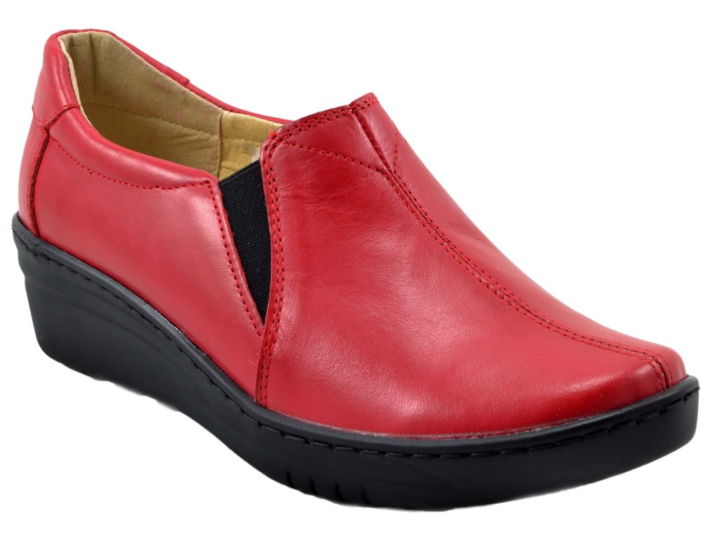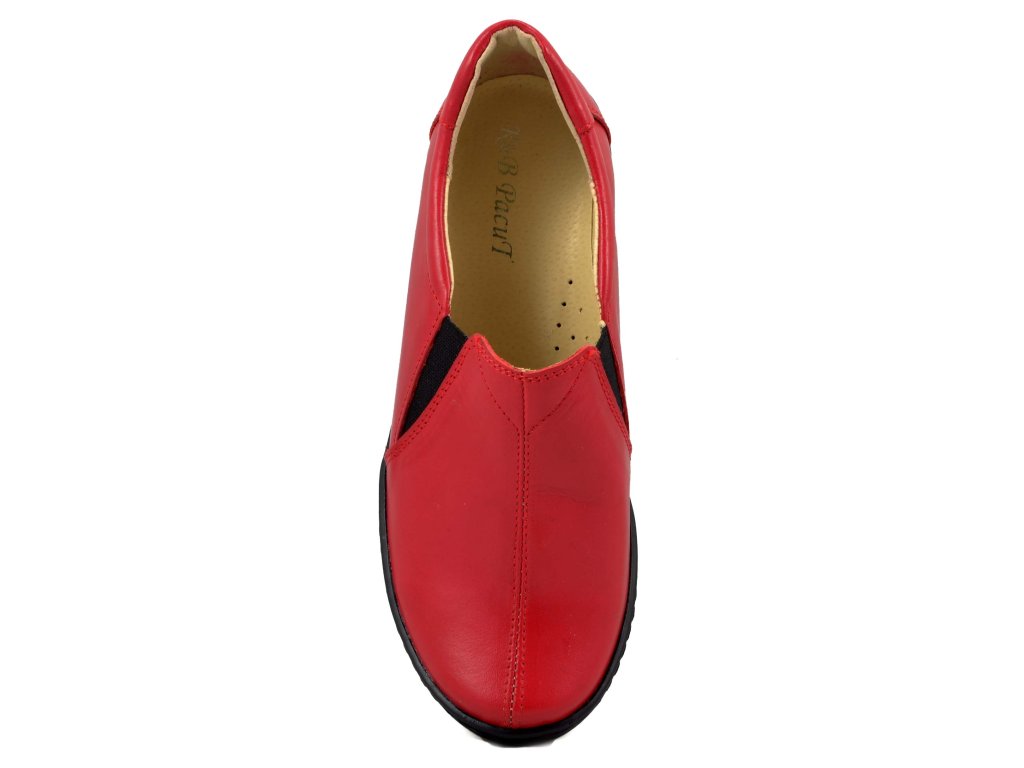Vyrobeno z červené hladké kůže jednoduše zdobeno prošíváním. Na Nártu opatřeno gumičkami pro snadné nazouvání a přizpůsobení obuvi nártu.